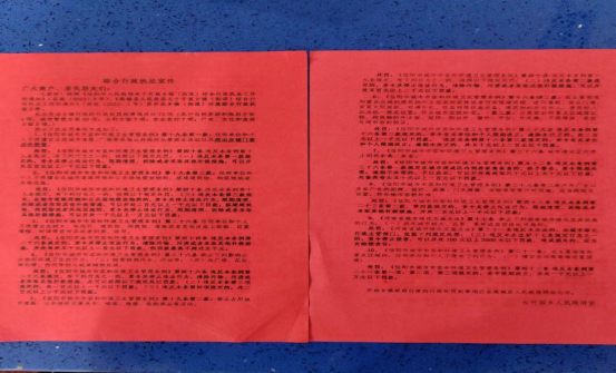 三是用好一張宣傳頁。宣傳是做好綜合行政執(zhí)法工作的必要方法。將與廣大商戶、居民生活密切相關的諸如店外經(jīng)營、私搭亂建等近10多項事項的規(guī)定及處罰依據(jù),制作成一張綜合行政執(zhí)法宣傳頁。在管理區(qū)域內(nèi)發(fā)放,廣泛宣傳,使轄區(qū)居民對此次下放鄉(xiāng)鎮(zhèn)的權(quán)限事項有了詳細的了解。