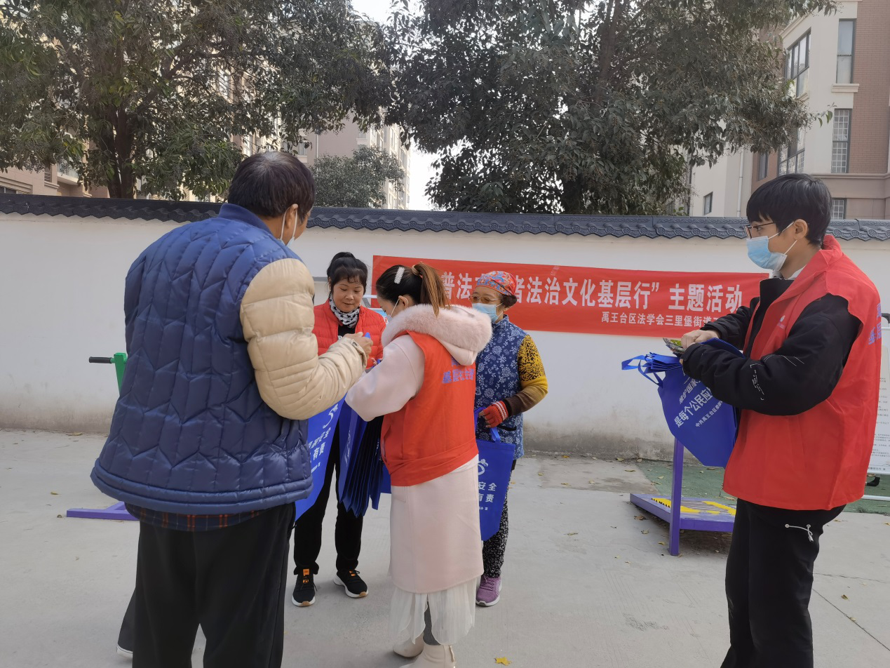 為進(jìn)一步提升社會群眾法治意識水平,建立法治觀念,增強(qiáng)群眾維護(hù)國家安全防范意識,確保法學(xué)會工作進(jìn)一步向基層延伸,打通法治服務(wù)最后一公里。禹王臺區(qū)法學(xué)會三里堡街道工作站聯(lián)合網(wǎng)格員在萊茵茗郡生活小廣場開展普法宣傳活動。