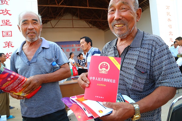 8日28日,河南省法學(xué)會(huì)法治傳播研究會(huì)和省人大常委會(huì)機(jī)關(guān)、省司法廳、省普法辦聯(lián)合主辦的河南省“憲法進(jìn)萬家法治助脫貧”活動(dòng)啟動(dòng)儀式在宜陽縣中峪村舉行。省人大常委會(huì)副秘書長、省法學(xué)會(huì)法治傳播研究會(huì)會(huì)長高欣,省司法廳副廳長魯建學(xué)等有關(guān)領(lǐng)導(dǎo),洛陽市、宜陽縣相關(guān)負(fù)責(zé)人出席儀式?;顒?dòng)現(xiàn)場(chǎng)為200多名群眾發(fā)放了《憲法》、《外出務(wù)工常用法律知識(shí)宣傳手冊(cè)》等法律書籍和光盤,并開展了一對(duì)一的法律咨詢和多種形式的法治宣傳。